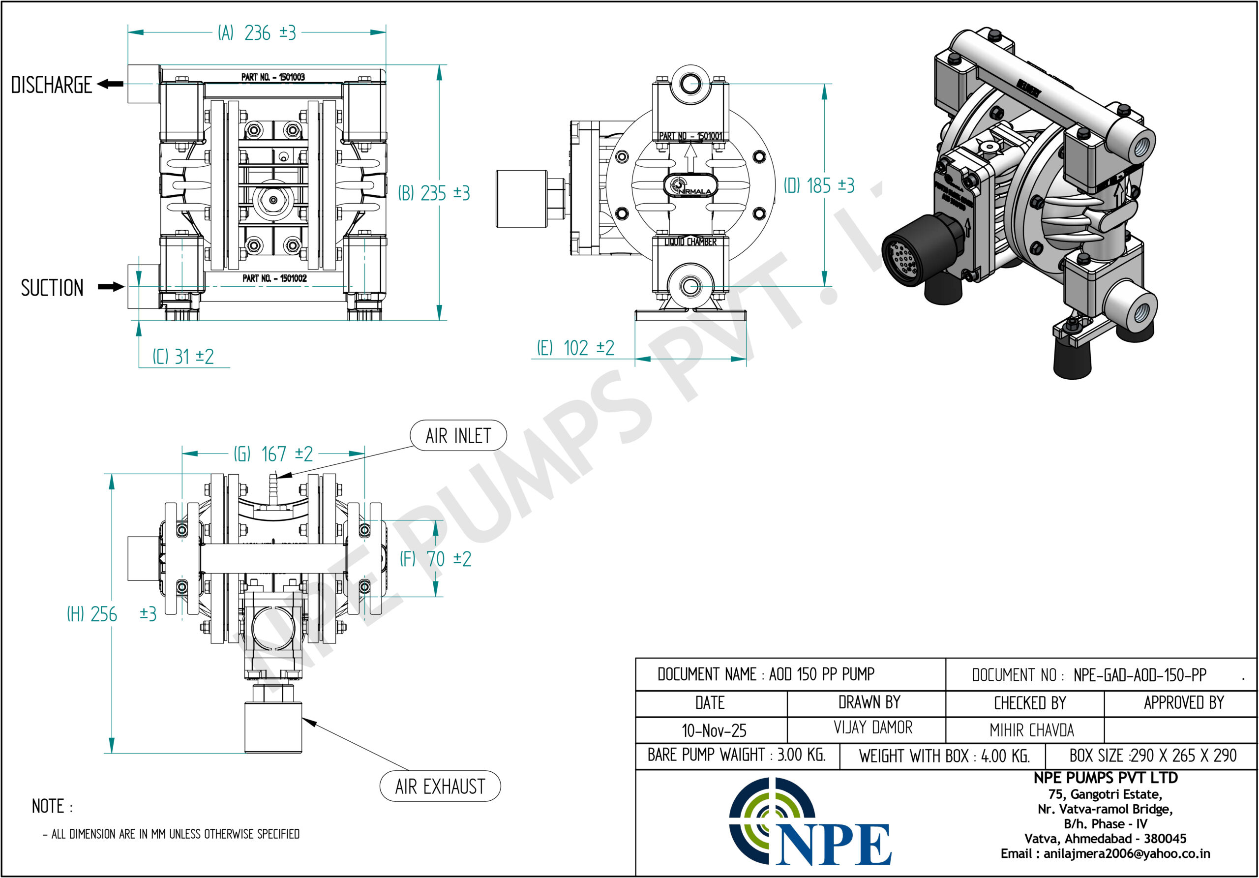 The 150 PP AODD Pump from Nirmala Pumps is a reliable solution for handling corrosive and chemical fluids. This model is widely searched as a 1/2-inch PP AODD pump for industrial use. Designed with strong parts, it offers long life, smooth flow, and easy maintenance. Our pump focuses on durability, leak-free operation, and safe fluid transfer. The pump is easy to use, works well for long hours, and does not need frequent maintenance. Its simple design helps in handling different types of fluids without trouble. We are one of the trusted 1/2-inch AODD Pump manufacturers in India.