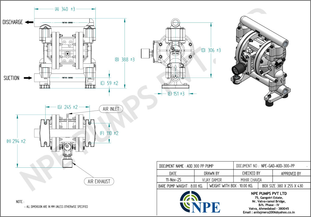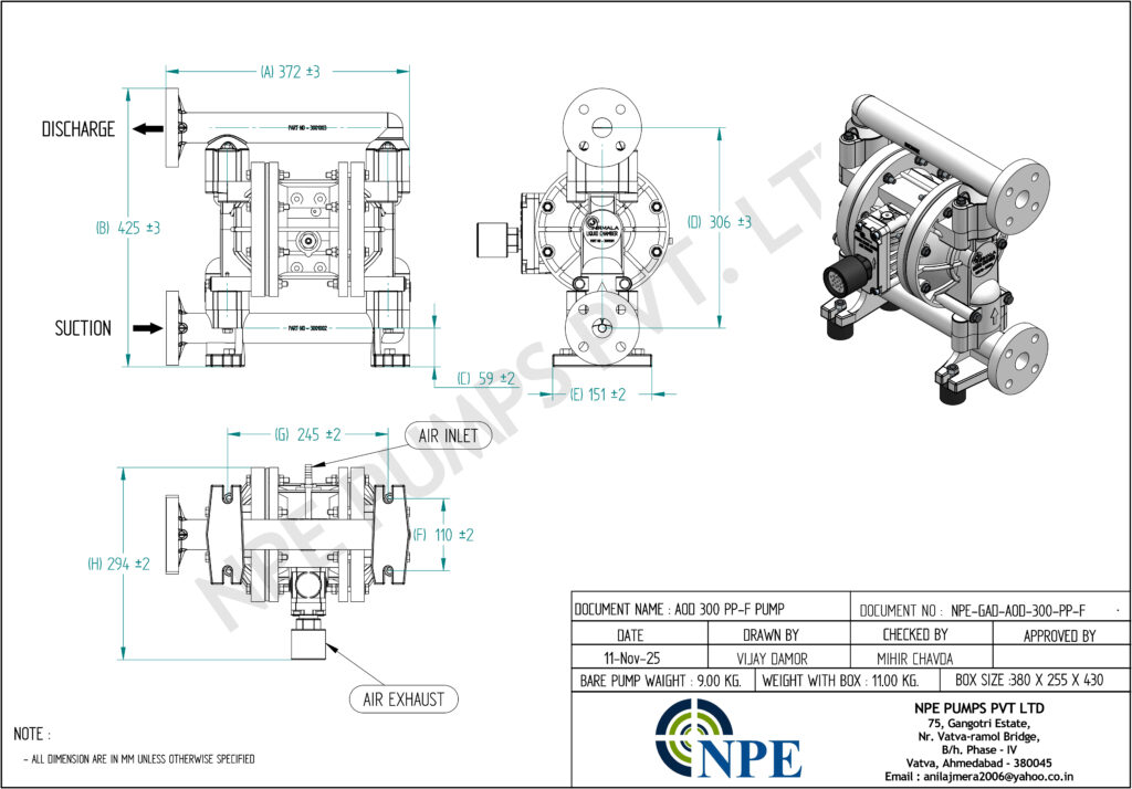 The 300 PP AODD Pump from Nirmala Pumps is a reliable solution for handling corrosive and chemical fluids. This model is widely searched as a 1-inch PP AODD pump for industrial use. Designed with strong parts, it offers long life, smooth flow, and easy maintenance. Our pump focuses on durability, leak-free operation, and safe fluid transfer. The pump is easy to use, works well for long hours, and does not need frequent maintenance. Its simple design helps in handling different types of fluids without trouble. We are one of the trusted 1-inch AODD Pump manufacturers in India.